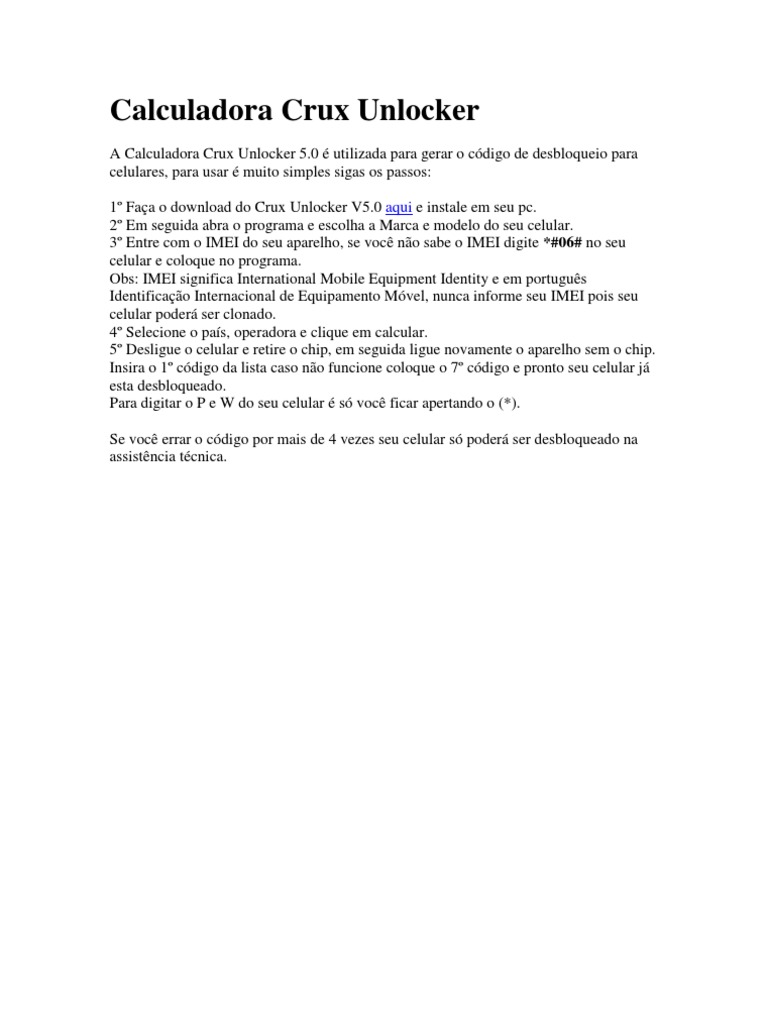 Crux Unlocker Download / Uniwersalny program do ściągania simlocka między innymi z takich telefonów jak:. Translate up to 5,000 characters. A calculadora crux unlocker 5.0 utilizada para gerar o cdigo de desbloqueio para celulares, para usar muito simples sigas os passos: Uniwersalny program do ściągania simlocka między innymi z takich telefonów jak: Samsunga sgh600, sgh2100, s105, x100, x600, . On that way, a new user needs only to download crux calculator,.